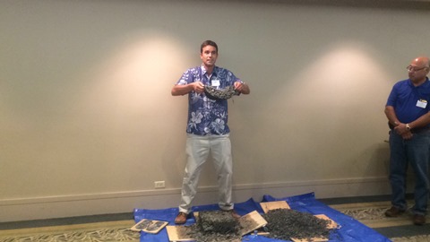 Lars Nelson holding aggregate on a piece of Geogrid.